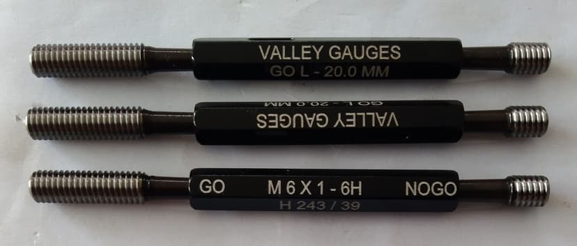 These gauges are used to check the accuracy and conformance of internal threads in drilled or tapped holes. They consist of cylindrical rods with external threads that match the specifications of the internal threads being checked. Thread plug gauges are available in "Go" and "No-go" varieties, with the go gauge verifying proper thread size and pitch, while the no-go gauge ensures that the threaded hole does not exceed the maximum allowable tolerance.